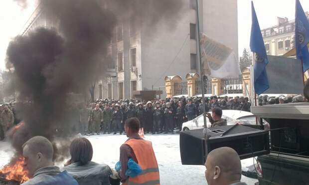 Фографии с места проведения акции на своей странице в Facebook опубликовал один из лидеров "Автомайдана" Сергей Коба.На снимках и видео видно, что силовики сформировали кордон перед администрацией, преграждая активистам путь к зданию. Пылающие покрышки пытались потушить из огнетушителя, о чем свидетельствует количество белого порошка, распыленного на месте акции.