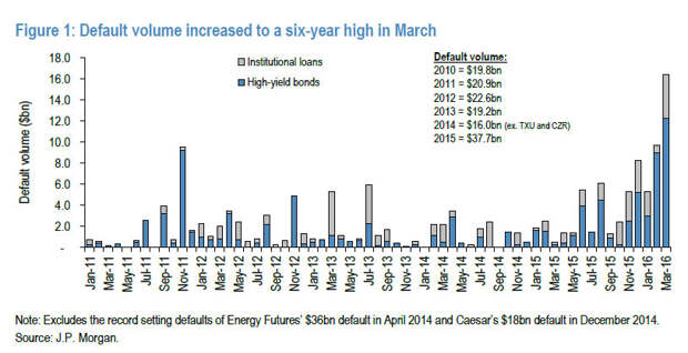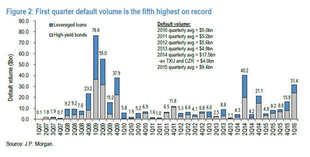 В марте в США объемы корпоративных дефолтов шустро рванули вверх, намекая о грядущем возврате славных рекордов первой волны суперкризиса. Месячный объем дефолтов составил $16.4 ярдов резаной, в разы превысив уровень "тепличной" эпохи QE3 - смотри рисунок. Квартальный объем составил - $31.4.