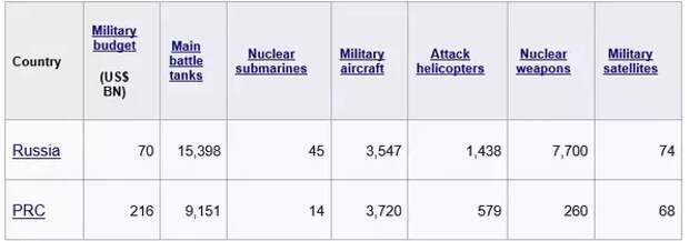 Общая таблица военного бюджета и основных видов вооружения России и Китая, такова: