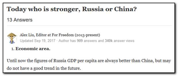 - «С экономической точки зрения, показатели ВВП России на душу населения всегда были лучше, чем в КНР. Хотя в период западного давления они и просели…