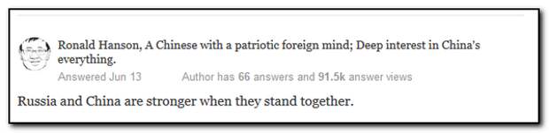 - «Россия и Китай сильнее, когда они стоят вместе. С глобальной геополитической точки зрения, Россия стала сильней и этим вызвала давление Америки. Коснулось это давление и КНР, причем по тем же самым принципиальным причинам. Сейчас Вашингтон считает Китай самым большим стратегическим соперником с позиции экономики и перспектив, но пока что, только у России есть возможности поставить под угрозу гегемонию США. Поэтому американцы и используют все средства, дабы раздувать проблемы.