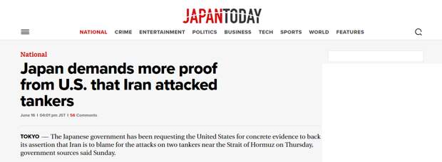 Нельзя не отметить, что, вопреки просьбе Петнагона "доверять нам", правительство Японии заявило, что ему необходимо конкретные доказательства, подтверждающие утверждение США о том, что Иран причатсне к нападению на два танкера в районе Ормузского пролива в четверг. Запрос поступил после того, как госсекретарь США Майк Помпео сделал заявление спустя несколько часов после нападений, обвиняя Иран без предоставления каких-либо доказательств.
