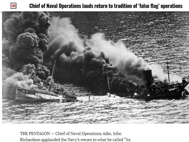 Начальник Военно-морских операций адмирал Джон Ричардсон в своей речи в пятницу приветствовал возвращение флота к тому, что он назвал "легендарной традицией операций под ложным флагом". В своем выступлении перед топовыми чиновниками и руководителями ВМС США Ричардсон отметил, что американский флот обвиняет в провокациях на море посторонних, так как "моряки-Янки были одеты как индейцы на Бостонском чаепитии в 1773 году.