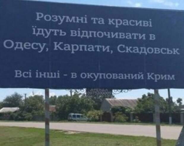 «Умные и красивые едут отдыхать в Одессу, Карпаты, Скадовск. Все остальные — в оккупированный Крым», — гласит надпись на плакате.