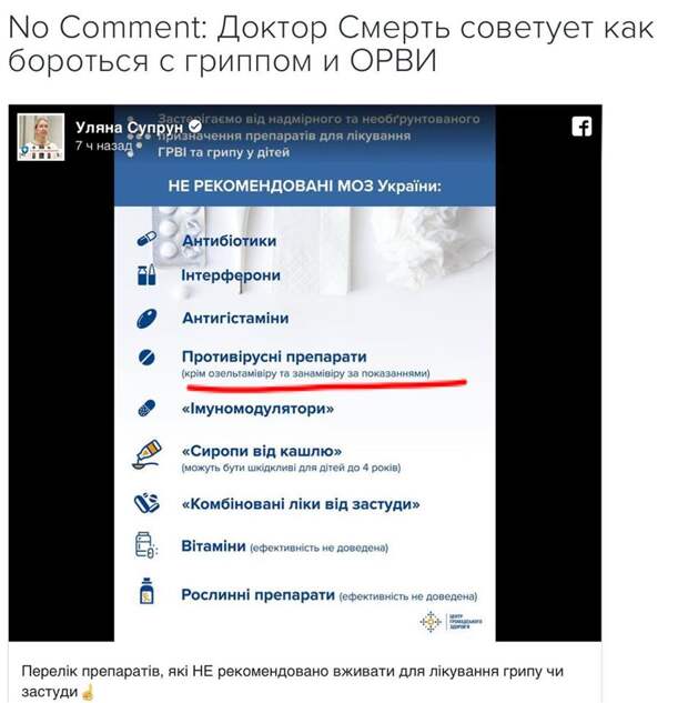 Ульяна Супрун даёт перечень препаратов, которые НЕ рекомендуется употреблять для лечения гриппа или простуды: "Большое количество лекарств или их высокая стоимость совсем не гарантируют, что эти препараты помогут вам вылечиться.