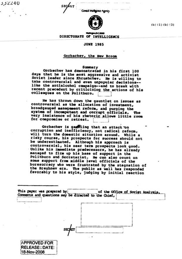 В документах указано, что работа Горбачева оценивается как рискованная, но, тем не менее, эффективная. В основном похвала за «борьбу с неэффективностью и коррупцией». Отмечается, что генсек стремительно продвигает на высокие должности своих знакомых сторонников, которых позже придется изолировать. Также американцы сетуют, что действия Горбачева не идут в одном темпе с его обещаниями: «Амбициозная повестка дня ставит Горбачева под мушку прицела… Надо будет постоянно доказывать свою правоту… Любая допущенная им ошибка приведет к консолидации оппозиции и ударит по нему самому».